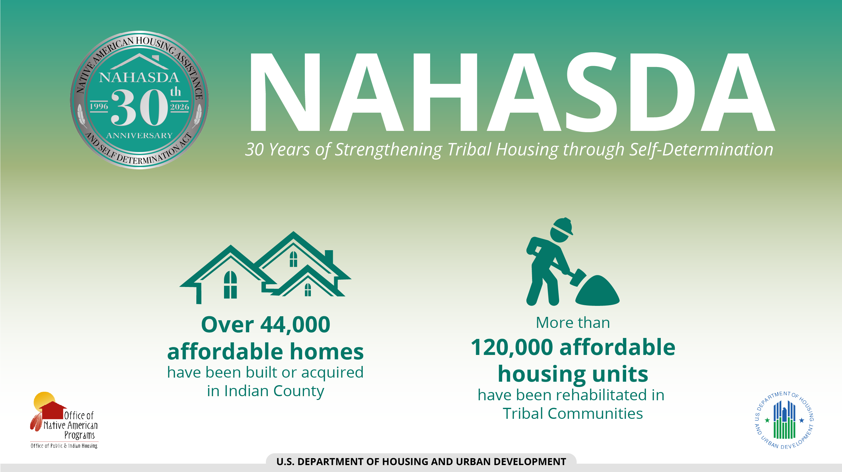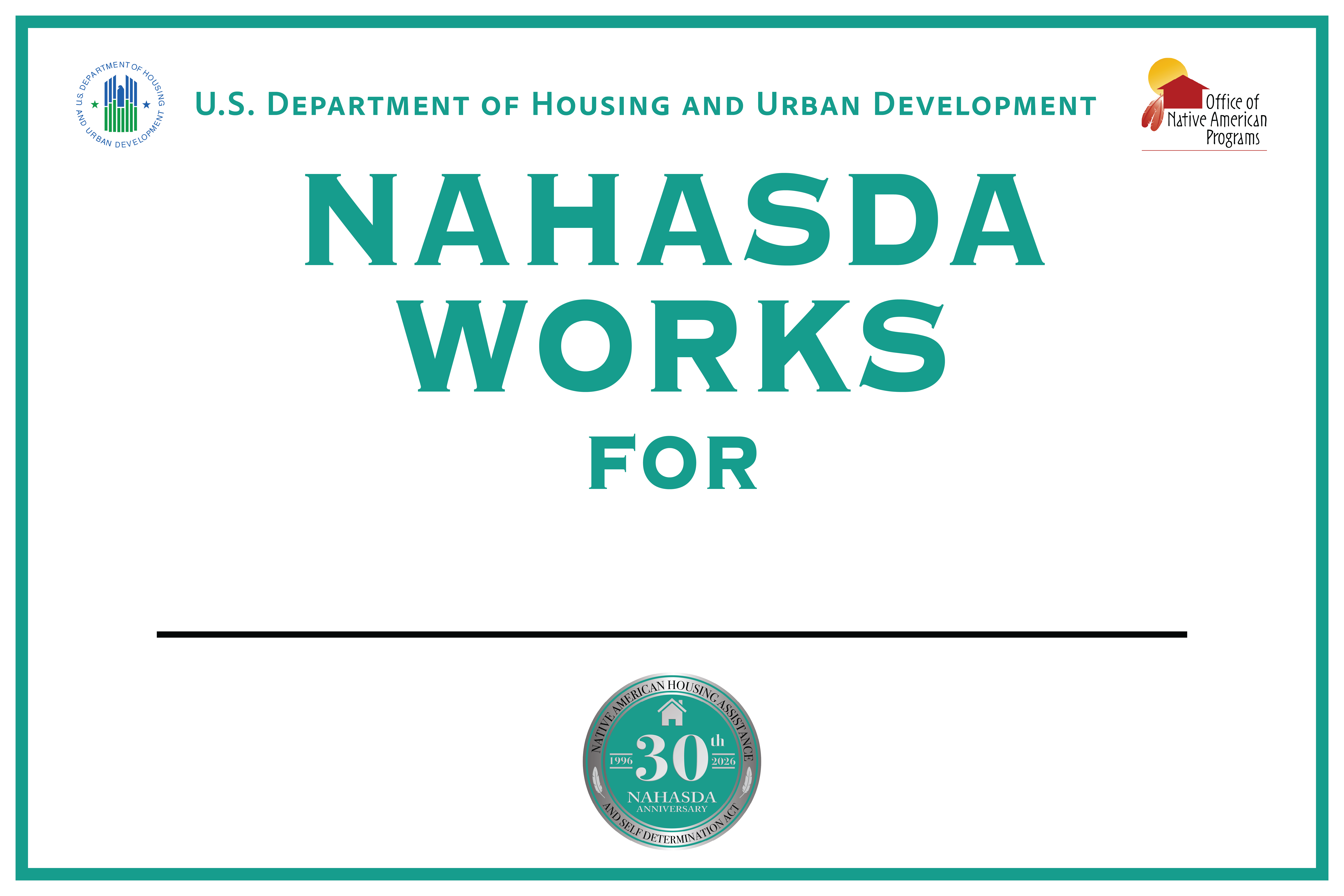 This year marks the 30th anniversary of the Native American Housing Assistance and Self-Determination Act of 1996 (NAHASDA). HUD invites Tribal leaders, Tribal housing practitioners, and stakeholders to join us in celebrating this important milestone by highlighting the impact NAHASDA has had in your community. On this page you will find a communications toolkit and graphics to make it easy for you to share your Tribe’s #NAHASDA30 story.